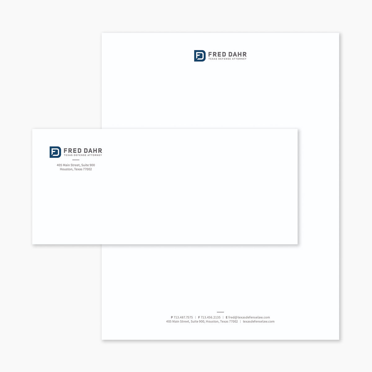 I developed a visual identity and stationery system for Houston-based defense attorney Fred Dahr. The mark combines his initials at sharp, deliberate angles, conveying confidence and precision, anchored by a bold D-shaped container that underscores defense.